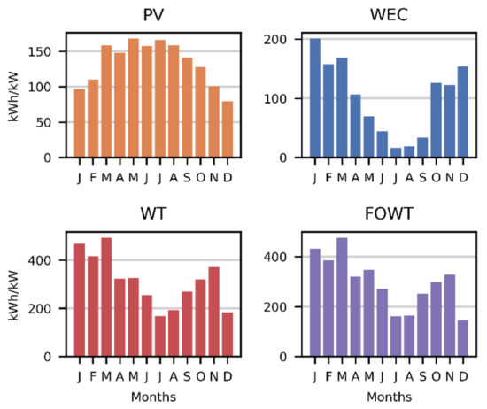 The FOWT hourly power production profile was estimated similarly to that of onshore wind turbines by using the Vestas V80 2 MW wind turbine’s power curve at a tower height of 80 m. The turbine has a cut-in speed of 4.0 m/s, a rated wind speed of 16.0 m/s, and a cut-out wind speed of 25.0 m/s; the specific turbine model, which falls into the IEC I wind class [], was chosen as it has been already installed on the IDEOL floating platform of the Floatgen project []. Floating structures were selected due to the seabed bathymetry around the island of Pantelleria, which does not allow the installation of bottom-fixed offshore wind turbines at all. The specific yearly productivity, obtained from the hourly wind speed and the turbine power curve, was estimated at 3580 kWh/kW; the value is slightly lower than for onshore wind turbines that, with their lower tower height, encounter fewer hours of wind speeds above the cut-out speed. The monthly specific production is reported in Figure 5. Due to the actual maturity level of the technology, floating offshore wind turbines were set to be installable from 2025 on. Their capacity was also treated as an integer variable, turning the model into a MILP problem. Their capital cost decreases from 3875 EUR/kW in 2020 to 2180 EUR/kW in 2030 and 1870 EUR/kW in 2050 [] (CC); their fixed cost was assumed as constant and equal to 200 EUR/kW/year [] (FC).