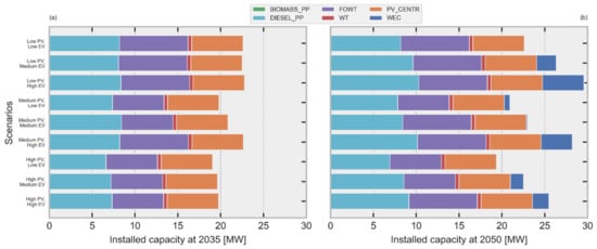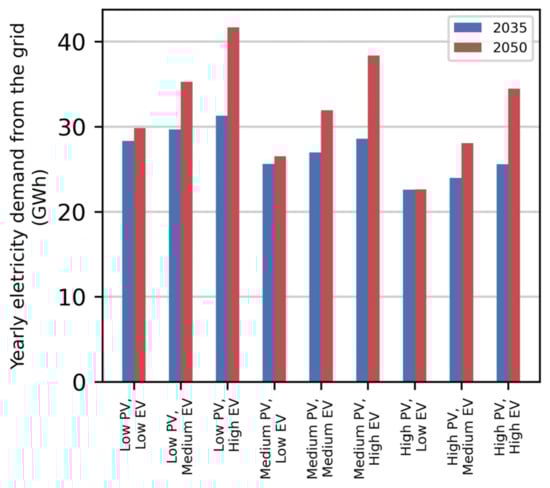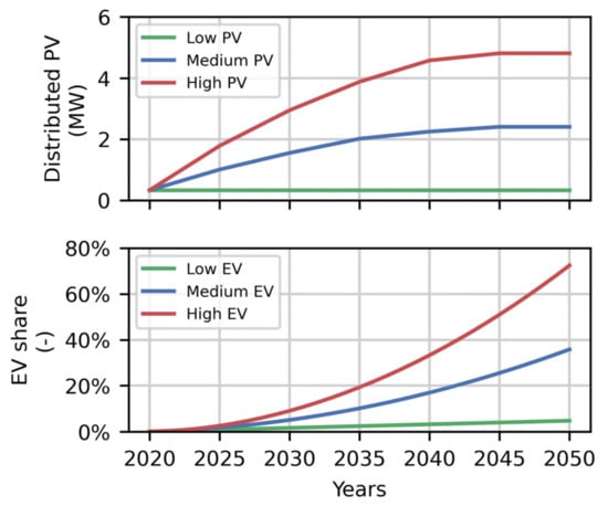 The settings for EV diffusion were developed based on the policy scenarios defined in the Global EV Outlook 2020 by IEA [], which forecasts the share of EV sales in 2025 and 2030 depending on the environmental sustainability level of global energy policies. The Low EV scenarios entail a fixed share of EV sales, equal to the share in 2019 (2.8%), for the whole studied period. The Medium EV scenarios follow the IEA’s Stated Policies Scenario, which forecasts an EV sales share of 9.4% in 2025 and 15.7% in 2030. The High EV scenarios, finally, follow the IEA’s Sustainable Development Scenario, with an EV sales share of 18.0% in 2025 and 31.5% in 2030. Trends have been linearly extrapolated up to 2050, with a final EV sales share of 40.9% for the Medium EV scenarios and 85.5% for the High EV scenarios. The yearly vehicle stock renewal rate has been calculated as the mean value of the last 20 years for Italy, which amounts to 5.54%, while the total amount of ICEV currently circulating in Pantelleria is 9560 []; both these values have been assumed as constant along the whole model period. Because of the rural environment of Pantelleria, the vehicle stock has been assumed to consist of 50% of passenger cars and 50% of SUVs/pick-ups/light trucks. Also, ICEV have been assumed to be equally divided between gasoline and diesel vehicles. Figure 7 (bottom) represents the resulting evolution of the EV share on the total vehicle stock for the sets of scenarios. The resulting average cost for the purchase of ICEV was estimated at 26,240 EUR/vehicle, which is considered constant along the whole simulation period. The average cost of EV in 2020 has been estimated at 48,450 EUR/vehicle, decreasing to 43,610 EUR/vehicle in 2035 and to 40,170 EUR/vehicle in 2050. Costs of vehicles and their future evolution trends were obtained from [].