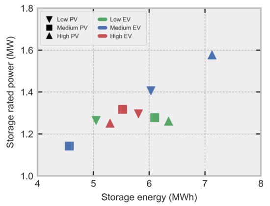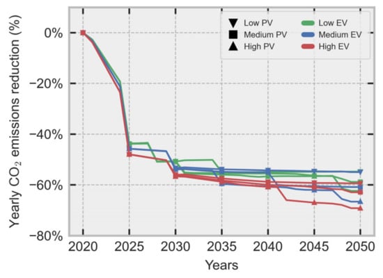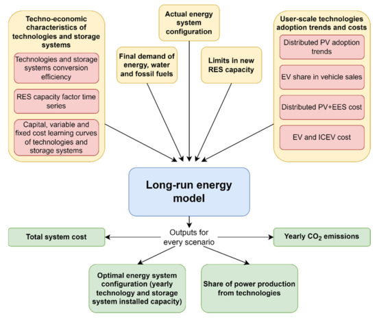 Great interest arises from the uncertainties related to community engagement and the uptake of energy technologies at the consumers’ premises, which could represent a potentially disruptive factor in the evolution of energy systems. Researchers have so far focused on the large-scale impacts of such factors. Gernaat et al. [] have estimated the global economic potential of rooftop PV that can lead to an 80% increase in the total PV share by 2050. Krause at al. [] have studied the effect of electric vehicles (EV) diffusion, forecasting a 30% increase in EU electricity consumption in a road transportation high electrification scenario. However, it is necessary to correlate trends in user-scale technology adoption with the optimal long-run evolution of energy systems to support the implementation of targeted energy policies.