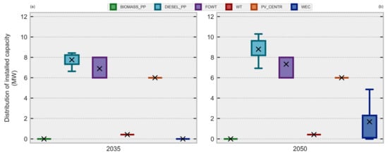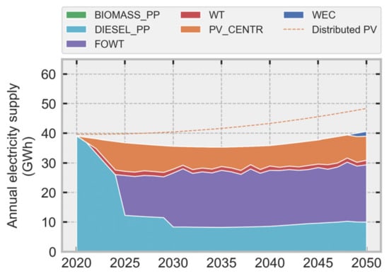 DIST_GRID is characterized by 4 independent 10.5 kV medium voltage grids starting from the diesel power plant, and the related low voltage subnets; overall, the island power network has large losses and a low level of innovation. The distribution technology was described through an efficiency of 80%. This value was obtained from the ratio between the electricity invoiced and the sum of the electricity produced from diesel power plant and distributed PV systems; all data were provided by the local Distribution System Operator. The distributed PV installed capacity (reference year: 2018) amounts to 330 kW: for consistency with the scenarios developed 2.3, and because of the averagely small size of the plants, their power production was subtracted to the overall power grid’s hourly demand, assuming a complete self-consumption by prosumers. There were no assumed costs associated with power distribution. In addition, at least 20% of the electricity production at every time slice has been set to be supplied by dispatchable technologies, in accordance with the minimum share of instantaneous conventional generation set by some European Transmission System Operators [].