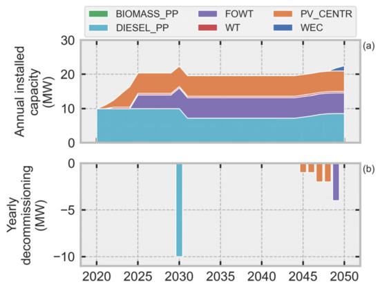 The DIESEL_PP currently operating on Pantelleria Island has a capacity of 10 MW; the end of life of its generators is foreseen in 2030; their overall conversion efficiency is 39%, according to the data communicated from the company managing the power plant. The capital cost of diesel generators was estimated at 1020 EUR/kW [] (CC), while fixed costs were neglected. Both DIESEL_PP and BIO_PP contribute to the reserve margin of Electricity_INT fuel that—as suggested in []—was set to 20%.