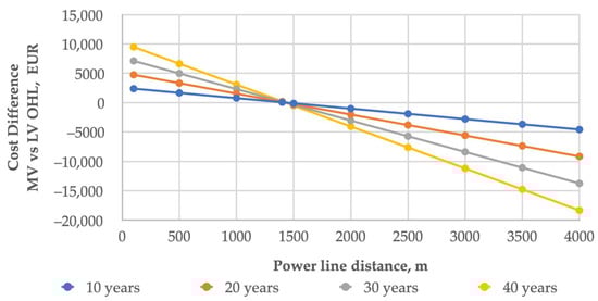 Difference between the total costs of the MV OHL and the LV OHL (positive cost if LV OHL is more feasible, and negative cost if MV OHL is more feasible).