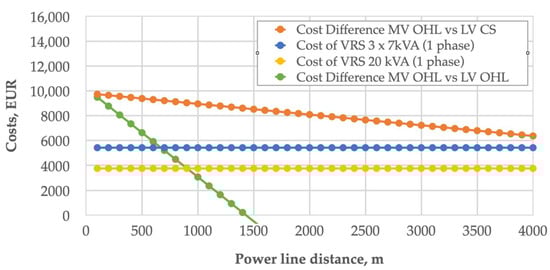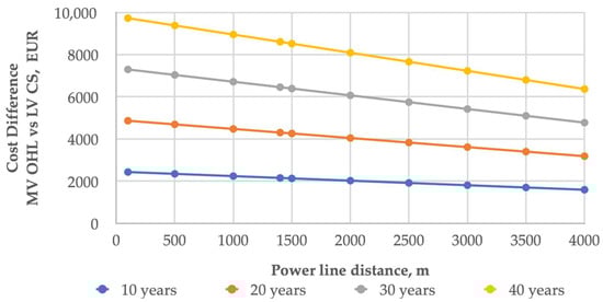 Based on the difference between the total investment costs of the MV OHL and the LV CS (Figure 2), it can be concluded that it would be feasible to replace LV CS with MV OHL only in the case of developing areas (long-term load prediction is increasing). For areas with a constant long-term load prediction, the total cost of LV CS is always lower than the total cost of MV OHL.