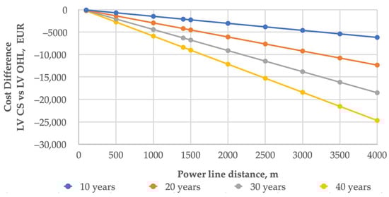 Based on the difference between the total costs of the LV CS and the total costs of the LV OHL (Figure 3), it is evident that it is always feasible to replace LV OHL with LV CS.