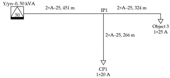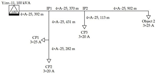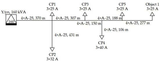 Measurements were conducted at the farthest connection point from the substation (Object 2 in Figure 6). Distance from the measurement point to the substation is 1.71 km. The connection point has a three-phase main fuse with a 25 A rated current, and the object’s yearly consumption is approximately 10,800 kWh.