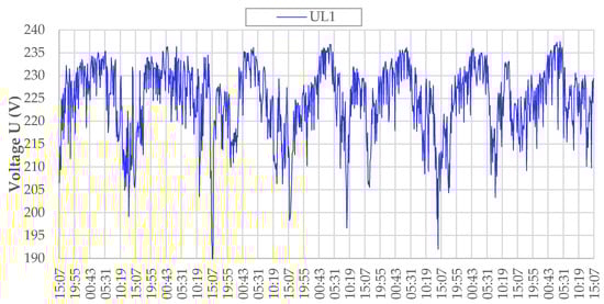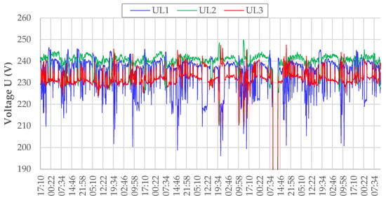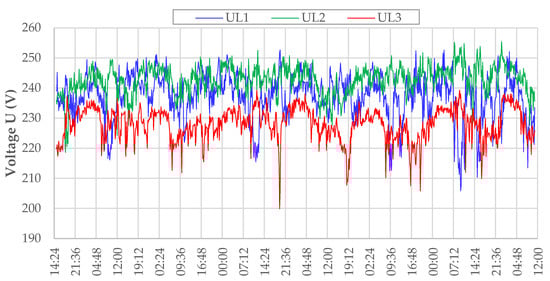 In this study, we chose results to track phase voltages at each connection point. QDS was carried out based on the data measured on 8 November 2016 with a time step of 1 s for a period of 5 h (from 13:00 to 18:00). The nominal voltage 1 p.u. was taken as 230 V for phase-to-neutral voltage and 400 V for phase-to-phase voltage. The simulation was carried out with the Newton–Raphson solution engine, which is the most suitable for distribution grids with unbalanced loads. Voltage limits were disabled to avoid regulation through the external grid and clearly illustrate the deep drops.