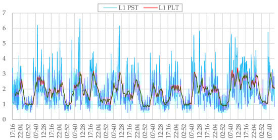 According to standard EN 50160, the maximum allowable values for voltage unbalance and flicker should not exceed 2% and 1, respectively. Furthermore, it is even recommended that the voltage unbalance remains below 1%. Flicker, on the other hand, is usually measured in two timeframes: short-term flicker perceptibility PST in a 10-min interval, and long-term flicker perceptibility PLT in a 120-min interval. However, only the long-term flicker perceptibility is standardised. According to [], in normal conditions, flicker perceptibility may not exceed the value PLT = 1 in 95% of measured instances in a week. Long-term flicker perceptibility PLT at Object 1 was higher during daytime and lower at nights, while the short-term flicker perceptibility even reached as high as 6.7.