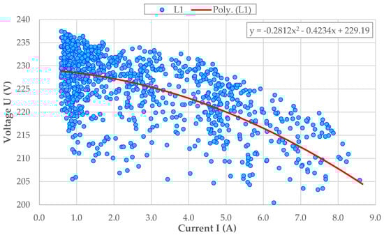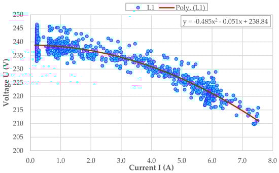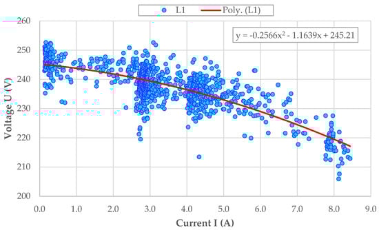 Phase L1 voltage–current curve with polynomial function describing the voltage drop dependency from the capacity of the load based on measurements in Object 2.