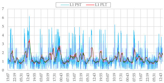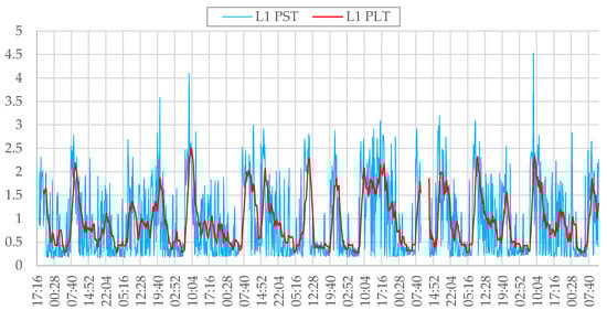 Flicker values for Object 1 in phase L1, according to standard EN 50160–PST in 10-min interval and PLT in 2-h average intervals (allowed limit <1.0 95% of the time).