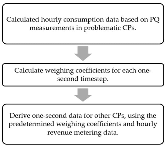 Since measurements were conducted only in the farthest CPs from the substation (Objects 1, 2, and 3), other CPs only have hourly data from revenue metering. For the simulations, the following method was used to create one-second data for simulations, as illustrated on Figure 18.