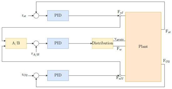 The incineration processes are generally controlled based on manipulating the variables of feeding rate, primary and secondary air flow, and grate speed transporting waste through the different drying, pyrolysis gasification, oxidation, and burnout zones [15]. A proportional–integral–derivative (PID) model is often used as a control strategy where the manipulated variables are coupled in loop with the measured steam and oxygen flow of the system. A schematic of a PID controller is shown in Figure 1.