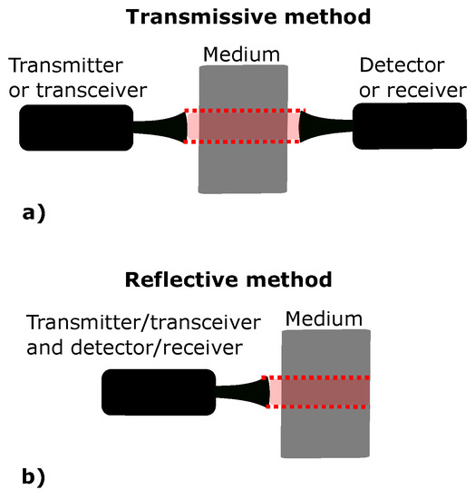 Sensors can operate in transmissive or reflective settings. A transmissive measurement in this assessment is based on using a transmitter and detector, as shown in Figure 2a. For the reflective method, the transmitter and detector are located on one side of the medium, as shown in Figure 2b.