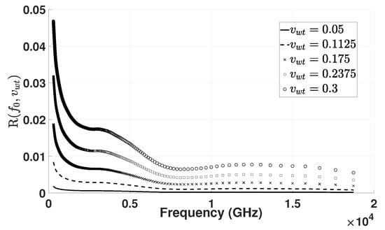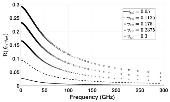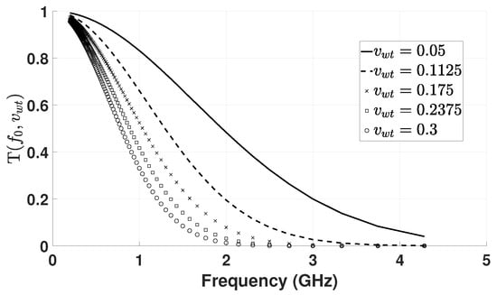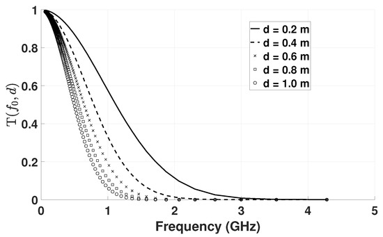 At and , the transmittance is reduced to its half at 1.90 GHz and 0.78 GHz, respectively, illustrating the radiowave sensitivity to moisture. The change in transmittance as a function of distance between 0.2 and 1 m can also be computed with a constant water volume fraction at 0.3, as shown in Figure 4.
