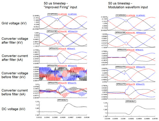 Simulation results for two different input modes of the universal converter model (“Improved Firing”, left; regular firing pulse, right), running at 5 microseconds in a two-level STATCOM application. Event shown is an AC reference voltage change from 1.0 to 1.1 pu.