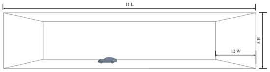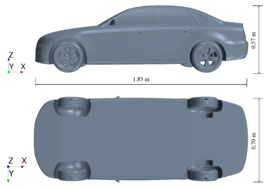 In this research, the 40%-scaled notchback DrivAer (with mirrors and smooth underbody) is selected as the car model (seen in Figure 1). The DrivAer model size is 1.85, 0.70 and 0.57 m in length, width and height respectively. The total frontal area is 0.35 m2. The radius of wheels is 0.1274 m and each wheel has five spokes. More detailed information about the DrivAer model can be found in a study by Heft et al. [19].