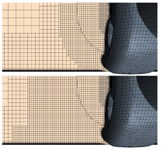 The surface mesh size of the main body is set at 4 mm, the size of wheels is set at 1 mm and the maximum CFL number is about 2.2. In order to improve the accuracy of the calculations, Y+ for the first boundary layer is set below 1 in most of the regions. The exceptions lie on the mirror and wheel contact patch as there are some small gaps which limit the grid generations, seen in Figure 3. In order to eliminate the interference of grid numbers, a grid-independence study is conducted: three different meshes are generated by shrinking the maximum volume of meshes, seen in Figure 4. Time-averaged drag and lift coefficient (CD and CL) varieties of MGRW are presented in Table 2.
