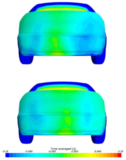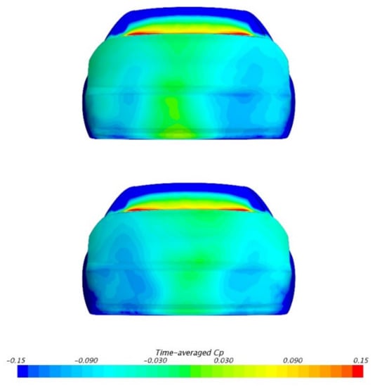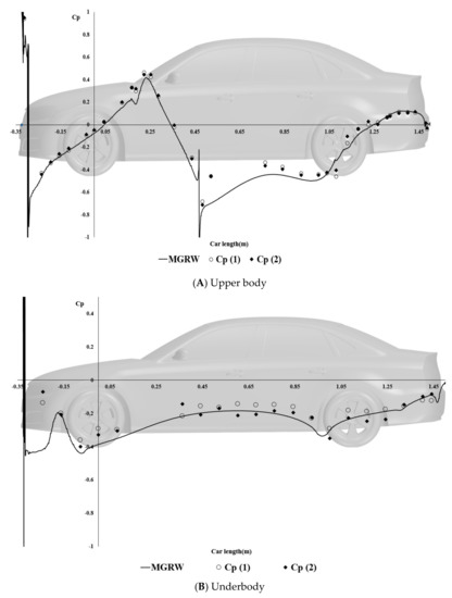 The time-averaged static pressure coefficient (CP) distribution on the center line of the car body of MGRW is shown in Figure 5. Experimental data from [19,26] are included, named CP (1) and CP (2), respectively. It can be seen that, both on the upper body and underbody, the differences between experimental data and the numerical simulation are relatively small, especially on the base region, which has the dominant effect on body drag. This indicates that the local flow field near the middle and the rear end of the car body are simulated accurately in this study. In the middle part of both the upper and underbody, the simulation results are slightly lower than those of the experimental data. It is supposed that this discrepancy results from the experimental setup. For example, the surface friction of the tested model is larger than the simulation, so the flow velocity is lower and the pressure is higher. However, in general, the accuracy of the numerical simulation of both the aerodynamic drag and pressure distribution in this study is acceptable; therefore, the CFD method is considered trustworthy.