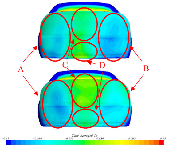 As the drag of the car body is mainly affected by the base pressure, it is necessary to investigate the pressure distribution on the base, seen in Figure 6. It must be mentioned that, in this study, the flow field results around the wake base are not completely symmetrical. It is considered that this phenomenon may result from numerical error from the time-averaged results. However, as the asymmetry of the results is not fundamental and they can still illustrate the main flow field characteristics, they are still considered acceptable. It can be seen that the base can be divided into four sub-regions according to the pressure distribution: Region A and B on the two sides of the base. These two sub-regions account for about 69% of the total base area and the pressure on them is relatively low. Region C is on the upper middle part (24% of the total area) and Region D (7% of the total area) on the lower middle part.