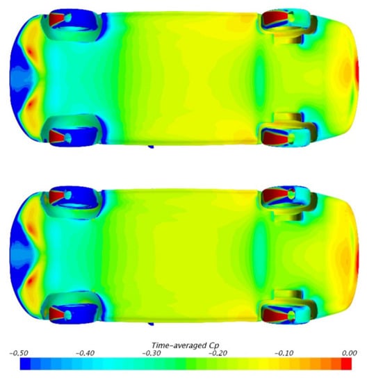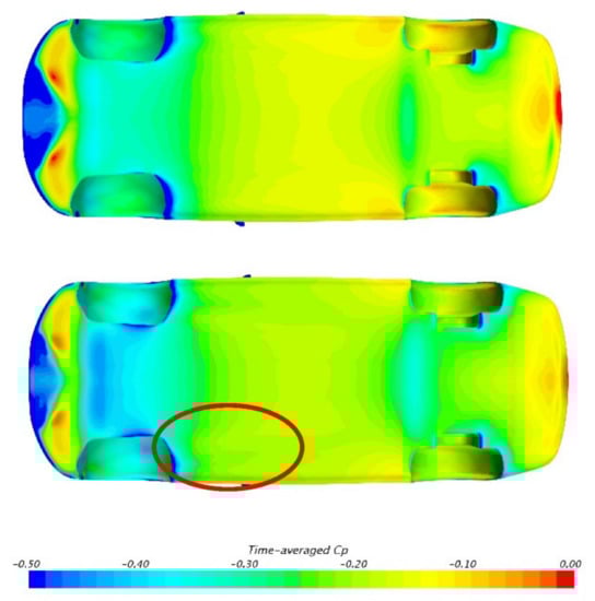Figure 7 illustrates the pressure distribution on the underbody. It is shown that the overall pressure in MGRW is obviously lower than SGSW, which corresponds to their lift coefficients. The decreased underbody pressure is supposed to be generated by the increased velocity of underbody flow, as the moving ground condition can eliminate the ground boundary layers. Moreover, another phenomenon that should be noticed is the low-pressure region behind the front wheelhouses in MGRW (marked in the red oval). However, as mentioned in previous studies, because the rotating wheel can reduce its own wake [3,12], the results in Figure 7 seem to be in contradiction.