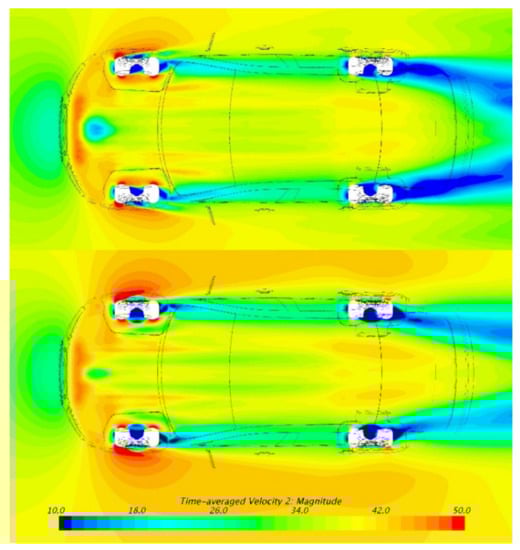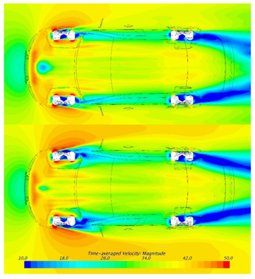 Figure 8 shows the time-averaged velocity contour on z = −0.07 m plane. This plane is located beneath the underbody. It can be seen that the velocity after the rear wheels significantly increases in MGRW, which can prove that the rear wheel wakes are weakened by rotating wheels. The width of rear wheel wakes is also reduced, which accelerates the flow between the wheels. Furthermore, the wakes of the front wheels are not obviously altered, which means that the wheel rotation mainly affects the rear wheels.