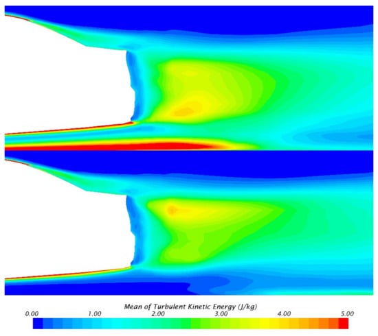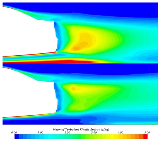 For comparisons with Wake Balance, the TKE on the center plane of SGSW and MGRW is shown in Figure 11. In MGRW, the TKE in the lower part of the center plane is significantly smaller than that in SGSW, indicating that the vortex in this area has basically formed and the strong velocity pulsation does not exist anymore. However, unlike the Wake Balance [14], the TKE of the upper and lower parts of the center plane is no longer symmetrical; therefore, the causes of the low-drag state may be different from those of the Wake Balance.