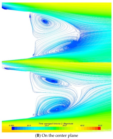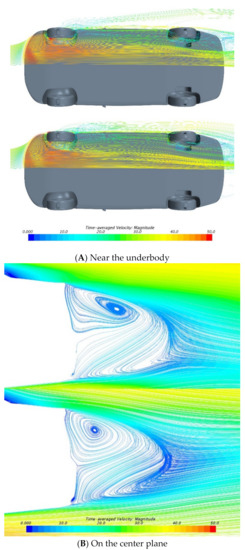 Figure 14A,B show the streamlines near the underbody and on the center plane, respectively. It can be seen from the streamlines that the width of both the front and rear wheel wakes is expanded when the ground is moving. This means that the elimination of the ground boundary layer leads to the enhancement of both the front and rear wheel wake, which may come from the accelerated flow near the wheel separation region. Furthermore, due to the expansion of the width of the front wheel wake, the middle area of the underbody is more strongly affected by the wheels, resulting not only in a decrease in air flow velocity in this area, but also a decrease in surface pressure.