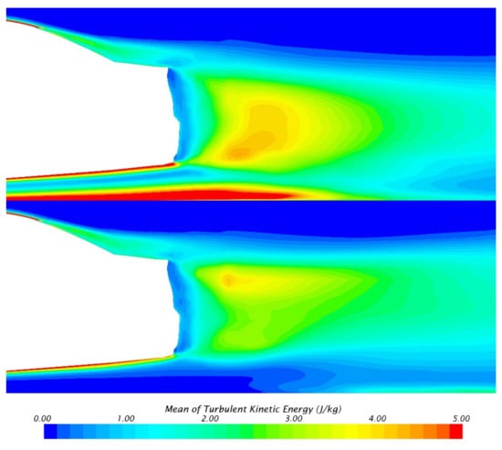 Figure 15 shows the time average TKE distribution on the center plane of the car body. It can be seen that, when the ground is moving, the TKE in the lower region is significantly reduced. This indicates that the vortex is stronger in this region, which is consistent with the pressure distribution in Figure 12. In addition, the upper and lower TKE regions of MGSW are basically symmetrical, which is in line with the description of Wake Balance [14]. However, as MGSW is not in the low-drag state, Wake Balance cannot simply be used to explain the base flow field in this study.