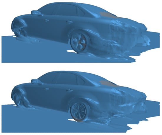 Figure 13 shows the velocity distribution near the underbody. The elimination of the ground boundary layer leads to the enhancement of both the front and rear wheel wake. As mentioned in Section 3.1, the strengthened rear wheel wake can reduce the pressure in Region A and B, which is consistent with the results in Figure 12 and Table 7.