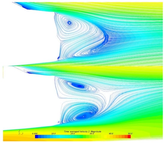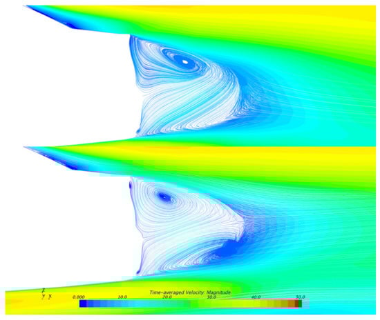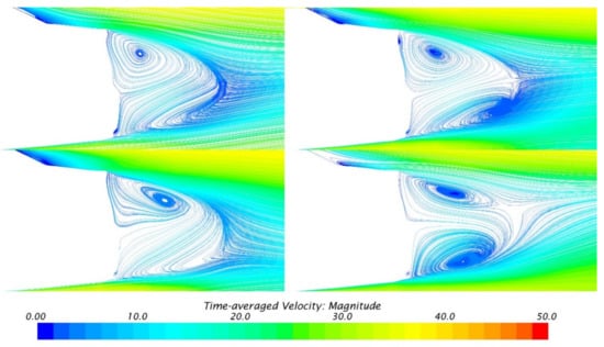 Although the local flow field changes near the wheels can be ensured, as the pressure changes in the Region C and D are also very significant, it is necessary to analyze the changes in the flow field in the middle area of the vehicle base. Figure 10 shows the streamlines on the central plane of the body. In SGSW, the upper and lower vortices are completely asymmetrical: the upper vortex is large in size, while the lower vortex looks small and incomplete. Moreover, the upper vortex is closer to the base and the lower vortex is farther.