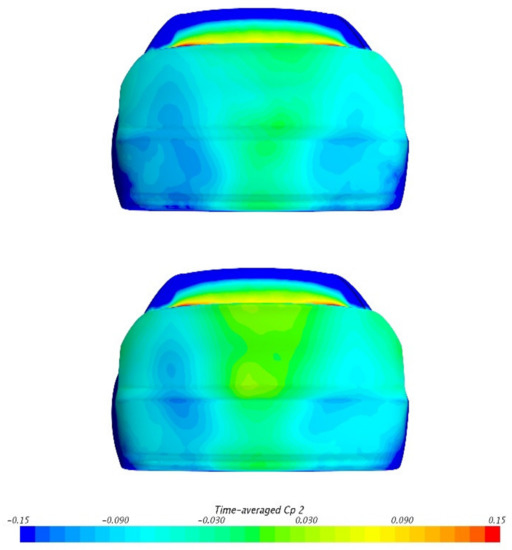 Detailed average CP values in these sub-regions are listed in Table 5. As the pressure distribution is not completely symmetrical, Region A and B are considered together. Compared with SGSW, the pressure on Region C is significantly higher in MGRW. The pressure on Region A&B also increases slightly, but the pressure on Region D decreases. The overall pressure discrepancies are consistent with the changes in the CD body. It must be noticed that, although the area of Region C is smaller, its pressure recovery is about five times larger than that in Region A&B; therefore, this sub-region has the dominant effect on total drag reduction. It can be supposed that Region A and B are related to the wakes of the rear wheels, as the rotating wheel can weaken the vehicle wake near the side of the base [3]. However, Region C and D are not clearly related to the wheels and ground; therefore, further investigation is required.