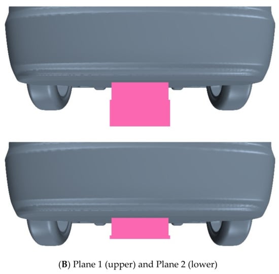 Table 15 shows the flow rate results on the two sets of planes near the rear wheels. Firstly, the results on the C1 and D1 planes are still similar to the results on Plane A and B. Since these two planes cover the entire ground clearance area, the average flow velocity on them is affected by the ground boundary layer, too. Moreover, when the wheels are rotating, the local effect of the rear wheel wake is not as strong as the front wheels; therefore, the wheel rotation will no longer decelerate the airflow of the underbody.