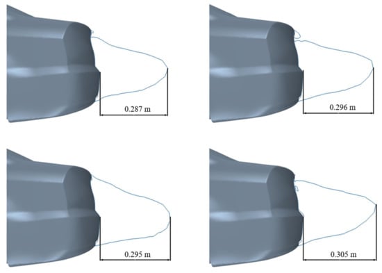 Figure 29 shows the iso-line of u = 0 on the center plane. The overall contour of the recirculation zone can be observed. It can be seen that as the flow rate near the underbody surface increases, the length of the recirculation region also increases, while the height of the stagnation point rises. Commonly, the lengthening of the recirculation region may weaken its effect on the base pressure and result in drag reduction, which corresponds to the results of drag reduction.