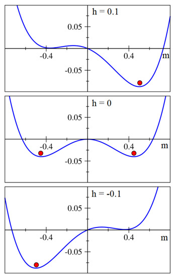 It has been pointed out in the monograph [24] that the hysteresis phenomenon may be related to the existence of a double-well energy landscape. Figure 1 depicts qualitatively how the energy landscape varies under the action of the applied field at constant temperature. For zero field, both energy minima are symmetric. They are separated by an energy barrier. The application of a magnetic field pushes the system out of equilibrium; thus, one of those minima becomes privileged and the other gradually disappears. This corresponds to an abrupt “jump” to another hysteresis loop branch, as shown in Figure 2.