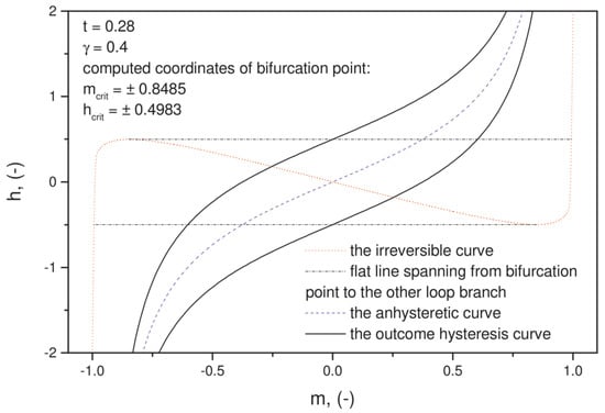 The Harrison model is a reasonably simple scalar description of hysteresis curves, which—despite its simplicity—has several interesting features and a solid physical background. A connection of the formalism to the double-well Gibbs energy profile often discussed in terms of bistable hysteretic systems was elucidated in [11]. The model developer has introduced a decomposition of total field strength into reversible and irreversible components. The self-consistent relationship is applied to the latter term, written briefly in dimensionless form as ( corresponds to reduced magnetization, to reduced applied field, whereas stands for dimensionless temperature). The internal “positive feedback” is thus relevant for the description of irreversible processes (the points in which the curve passing through the second and the fourth quadrants of the plane changes its monotonicity are the so-called bifurcation points [12], strictly related to the coercive field strength).