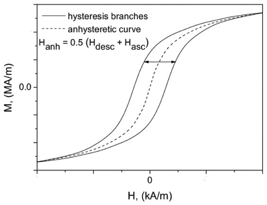 The “classical” method to experimentally determine the anhysteretic curve has been described in the literature [35,36]. For a preset field strength value , the amplitude of slowly varying alternating signal is gradually diminished until an equilibrium state is reached. This process has to be repeated many times; consequently, it is very tedious and time-consuming. Therefore, a simpler alternative to recover the anhysteretic curve as the middle curve from the measured hysteresis curve [37] was applied in this paper. The approach is shown in Figure 5. In the figure, the data markers at the axes were removed in order not to distract the attention of readers with some irrelevant details.