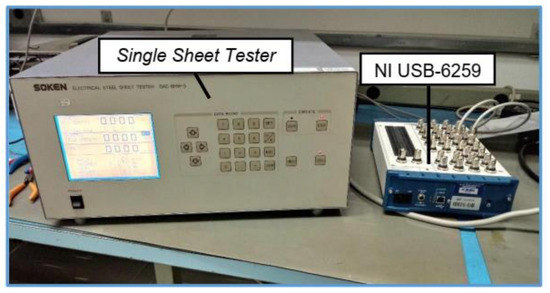 A photograph of the experimental setup that was used to measure hysteresis loops with SST and NI board (USB-6259) that acquired H and B experimental data.