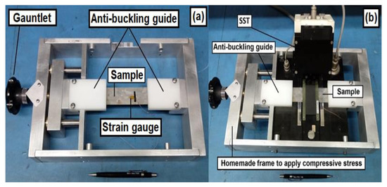 To perform the magnetic measurements under compressive stress, a frame with dimensions 334.2 × 200 × 50.8 mm was attached to SST, a strain gauge of Excell Sensors, model PA-06–060BG-350-LEN, was glued on the sample surface using OMEGA instant adhesive, model LOCTITE 496, and two anti-buckling guides were used to avoid buckling. Since the strain gauge could measure the thermal strain produced by temperature variation, the temperature of the test was controlled by an air conditioner, and it was held at 23 °C; thus, it is possible to infer that the strain measured by a strain gauge is only related to mechanical stress.