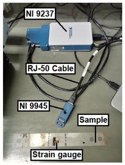 The compressive stress control was performed by Hooke’s law with Young’s modulus of pure iron at [100], i.e., 132.4 GPa [39], and the strain was measured by National Instruments Wheatstone Bridge, model NI 9237, using a CDAQ-9171 connector. This Wheatstone Bridge was built with a one-quarter configuration using a strain gauge (gauge factor of 2.14 and 350 Ω) linked to NI 9237 using a NI 9945 connector and armored RJ-50 cable, as can be seen in Figure 8.