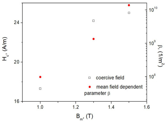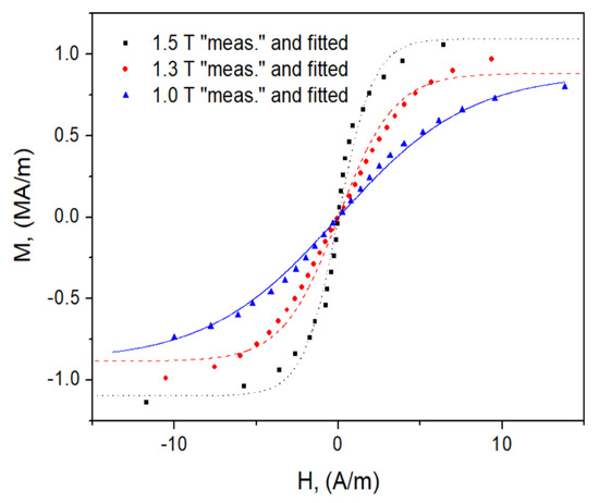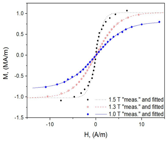 From the results presented in Figure 9, it can be concluded that the hyperbolic tangent function might be appropriate for the description of anhysteretic curves for the considered material in a wide range of excitation amplitudes; however, the slope of the curve depends on Therefore, the relationship for the anhysteretic curve is