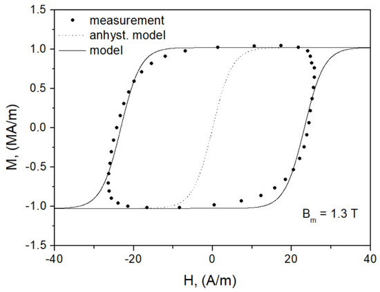 Figure 11 provides the measured values of coercive field strength and the computed values, whereas Figure 12 presents a visual comparison of the modeled and the measured symmetric minor loop for T. The anhysteretic curve was modeled using Equation (3). It can be stated that despite its high simplicity level, the model can generally describe the symmetric minor loops satisfactorily.
