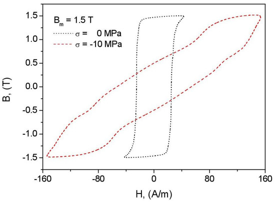 As discussed in the introduction section, it is important to measure the hysteresis loops under compressive stress since this will be the condition closely to transformer operation. Thus, the general approach to recover anhysteretic magnetization from measured hysteresis loops outlined in the previous section is also applicable to samples under applied stress. Figure 13 illustrates a qualitative change of shape of hysteresis loops when (a) the sample is not stressed and (b) the sample is subject to compressive stress σ = −10 MPa. It is clear that the slope of the sample without stress is significantly steeper. In order to capture the effect, the value of scaling parameter in the proposed hyperbolic tangent relationship should be increased; thus, for compressive stress, which is taken as negative ( for tensile stress ), it is possible to rewrite Equation (3) in a general form