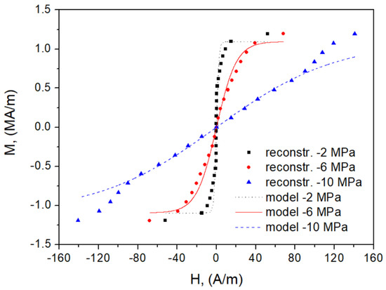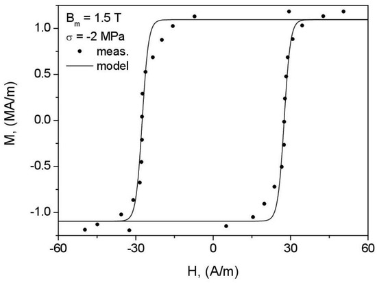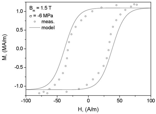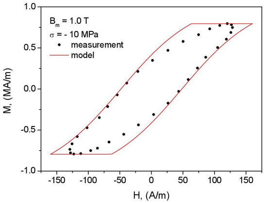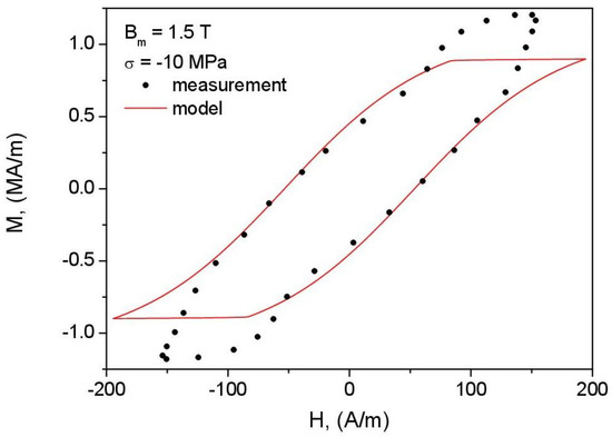 - The consequence of the previously formulated conclusion on the effect of correct identification of the anhysteretic curve on the overall performance of the model is the distortion of loop shape for = 1.5 T, = −10 MPa (Figure 19). The highly simplified character of the model (the assumption of only two wells in the Gibbs energy profile as well as the discrepancy between the modeled and reconstructed anhysteretic curves, c.f. Figure 14) contributed to the fact that the model could not describe the complicated loop shape in this case.