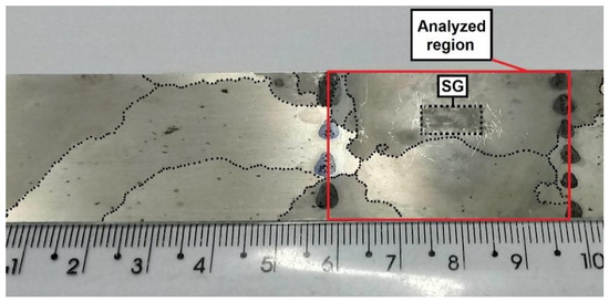 It can be noticed that for the highest value of compressive stress, MPa, for A/m, the anhysteretic curve fitted with Equation (2) deviates significantly from the one recovered as the middle curve, as shown in Figure 5. These discrepancies could be related to experimental issues since the GOES grain area is comparable to the analyzed pick-up coil area of SST. Consequently, during the magnetization process, if these grains have distinctive Goss texture misalignment, the hysteresis loops will show a mix of both grains’ behavior. Figure 15 shows a photograph of GOES structure, in which the dotted lines are the grain boundaries, the red square delimits the pick-up coil area (4 × 3 cm), and the SG area corresponds to the spot where the strain gauge was glued.