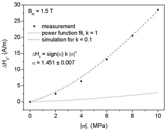 The form of the pressure-dependent function may be assumed from coercive field measurements. In the past, some authors have suggested power-law relationships, linking the dependencies of coercive field strength on dislocation density, strain, etc. [59,60,61,62]. Following their line of reasoning and assuming a linear work regime, in Figure 16, the measured dependence of excess coercive field strength (the difference versus at Bm = 1.5 T is presented. The value of stress-free sample was assumed to be A/m. Moreover, in this figure, the same functional dependence is simulated, but with the weighting coefficient, decreased to 0.2. This simulation discloses that it is straightforward to model the loss asymmetry of compression–tension characteristics [63,64,65] (in the first approximation, power losses are proportional to ). It should be recalled that the aforementioned asymmetry holds not only for power losses but also for magnetostriction [3]; this effect has been addressed in some other stress-dependent hysteresis models [6,7,8,38].