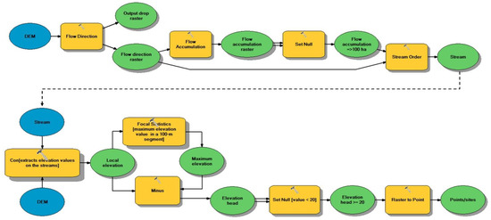 A model builder created for locating points with a minimum elevation head of 20 m along river channels. The yellow-colored rectangle with the hammer sign indicates the toolset used in the analysis. The blue-colored oval shape indicates the input data while the green-colored indicates the output.