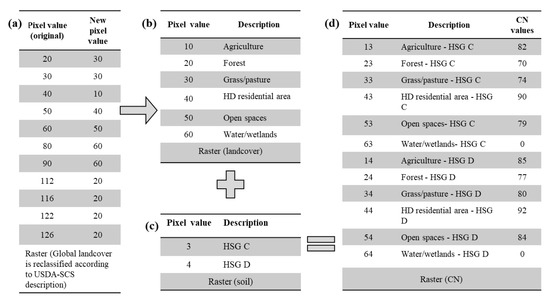 Process of CN raster creation from the landcover and HSG raster datasets. (a) The landcover raster is regrouped into landuses based on Table 2 and reclassified with new pixel values. (b) The reclassified landcover raster and its description. (c) The soil raster with its raster value added to the landcover raster in (b). (d) The sum of landcover and soil rasters reclassified according to the appropriate CN values of Table 2.