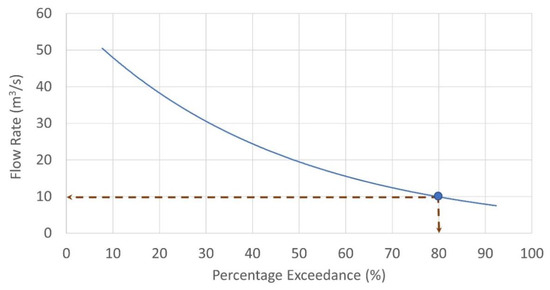 An example of a flow duration curve showing the equivalent flow of 10 m3/s at 80% flow exceedance.
