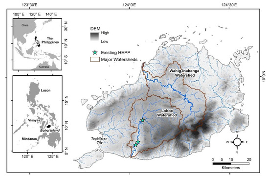 The island has two major watersheds: the Loboc and the Wahig-Inabanga Watersheds. All three existing run-of-river hydroelectric power plants are found in the Loboc Watershed along the main trunk: Sevilla mini HEPP, Loboc mini HEPP (LHEP), and Janopol HEPP (small HEPP) with a combined dependable capacity of 8.7 MW [52]. In 2015, these hydropower plants supplied around 11% of the island’s peak energy demand of 77-MW while the Visayas Grid (Leyte–Bohol Transmission Interconnection) provided most of the island’s energy needs [4].