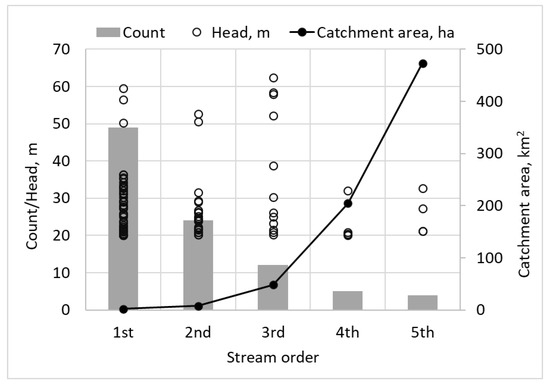 The potential sites fall under different stream orders that vary with elevation heads and catchment areas, as shown in Figure 8. Using Strahler’s stream ordering system, five stream orders are identified in the study area. The longest river, a fifth-order stream, has a total length of 83.3 km but no potential site is found. More than half of the sites (or 52%) are found in the first-order streams, while only four are in the fifth-order streams. The number of potential sites decreases with increasing stream order. A similar trend was found in the study of [16] in the Taw at Umberleigh catchment of South West England where more than half of the detected locations are found in the first-order channels, and the number decreases as the channel order increases. Twelve sites with third-order streams have the highest average elevation head of 36.4 m, while five with fourth-order streams have the lowest average elevation head of 22.8 m. Results indicated no correlation between stream order and elevation head. Four sites found in fifth-order streams have the highest average catchment area of 473 km2, while more than half of the identified sites have first-order streams with an average catchment area of only 2 km2. The sites’ catchment areas increase with stream order.