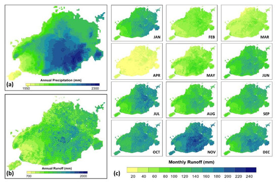 Spatial variation of (a) mean annual precipitation, (b) mean annual runoff depth, and (c) mean monthly runoff estimated using CN method.